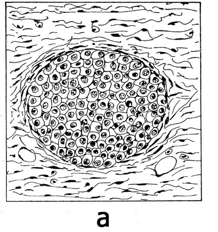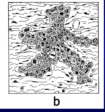 a large nucleus, having an irregular size and shape, the nucleoli are prominent, the cytoplasm is scarce and intensly colored or, on the contrary, is pale