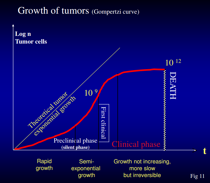 The curve has an early, almost exponential growth rate followed by slower growth rate which reaches a plateau as tumors grow larger in size.