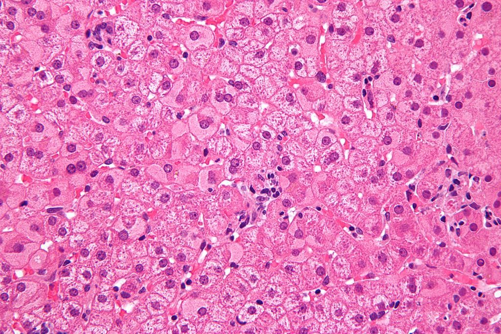 Hepatozyt mit aufgetriebenem, transparentem Zytoplasma. Entsteht durch Hyperplasie des endoplasmatischen Retikulums, das wiederum durch eine gesteigerte Produktion des viralen Hüllmaterials (HBs-Antigen) bedingt ist HEPATITIS