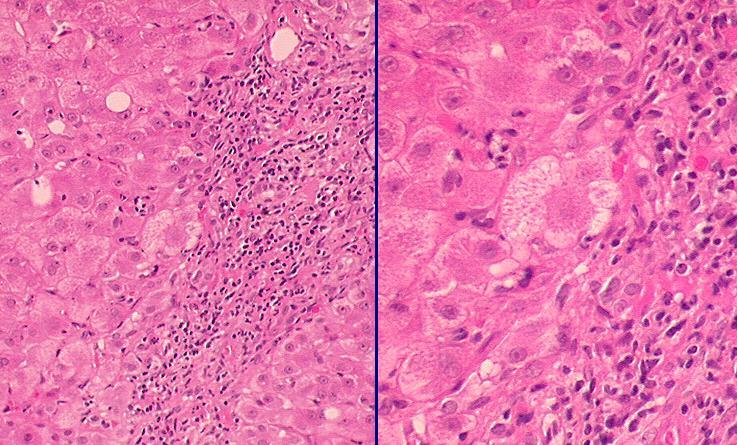 Periportale Leberzellnekrose mit lymphozytärer Infiltration . Sie spricht für eine chronisch aktive Hepatitisform und ist ein prognostisch ungünstiges Zeichen