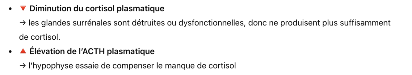 La maladie d’Addison se caractérise par une élévation d’ACTH plasmatique et une diminution du cortisol plasmatique