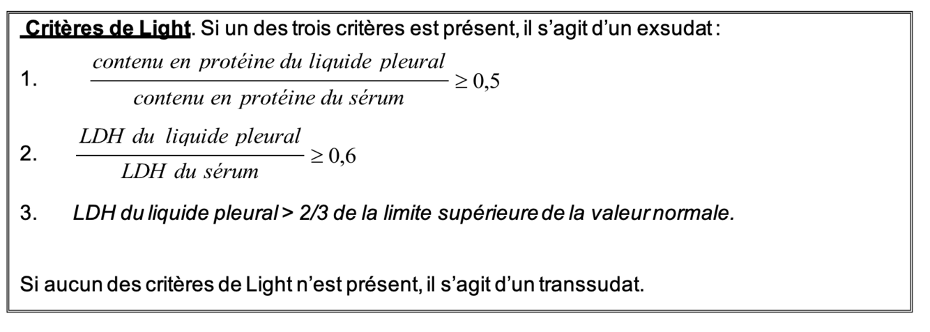 elle consiste à déterminer, à l’aide des critères de Light, s’il s’agit d’un exsudat ou d’un transsudat. Cette étape est primordiale afin de préciser quel est le diagnostic différentiel et le besoin d’investigation supplémentaire.