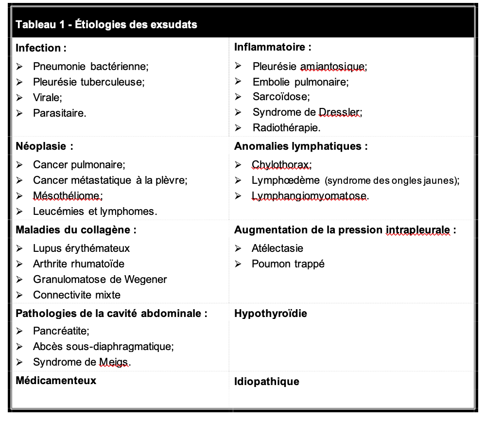 d’une inflammation pulmonaire ou pleurale amenant une fuite protéique. Le drainage lymphatique peut-être également diminué. L’exsudat peut être aussi secondaire à un mouvement de liquide de l’espace péritonéal (Tableau 1).