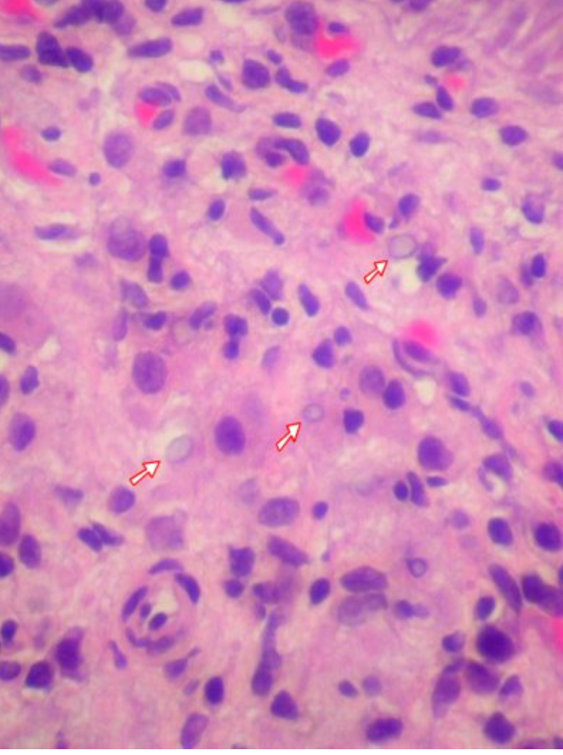 The presence of permissive EBV replication makes OHL unique compared to EBV-associated malignancies; however, latency-associated genes are also concomitantly expressed in OHL (Sandvej et al., 1992, Thomas et al., 1991, Webster-Cyriaque & Raab-Traub, 1998, Webster-Cyriaque et al., 2000), which may influence regulation of cell proliferation and apoptosis and likely contribute to its histopathologic features (Walling, 2000). EBV replication in OHL does not culminate in cell lysis, likely due to the expression of anti-apoptotic viral genes, such as LMP1, which induces anti-apoptotic cellular gene expression, and BHRF1, which acts as a viral Bcl-2 homologue (Henderson et al., 1993). EBV oncogenic gene expression and the consequential cell survival in the face of extensive viral replication likely contribute to acanthosis, a hypertrophy of the infected epithelium at the spinous layer with EBV replication itself contributing to the koilocytic changes characteristic of OHL (Becker et al., 1991, Dawson et al., 1995, Triantos et al., 1997, Webster-Cyriaque & Raab-Traub, 1998). OHL may also exhibit a heterogeneous EBV infection characterized by co-infection of different EBV types and strain variants (Walling et al., 1992, Walling et al., 1994, Walling et al., 1995, Walling et al., 1999, Walling & Raab-Traub, 1994). Similar heterogeneous EBV infections have also been detected in immunocompetent individuals and could potentially enhance EBV pathogenicity in OHL (Burrows et al., 1996, Gan et al., 2002, Kelly et al., 2002, Midgley et al., 2000, Walling, 2000).