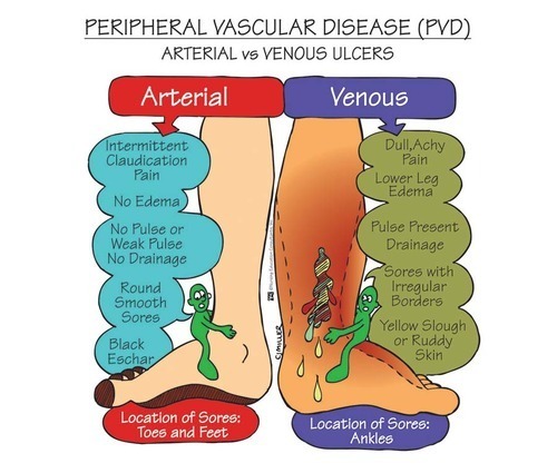 PVD LE: Edematous; Thick, tough, brown-tinged skin; Wet ulcers c/macerated border @ ANKLE