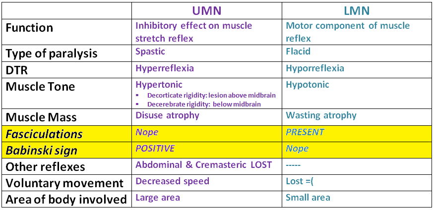UMN: Hyperreflexive DTR, no fasiculations - BABINKSI sign