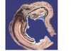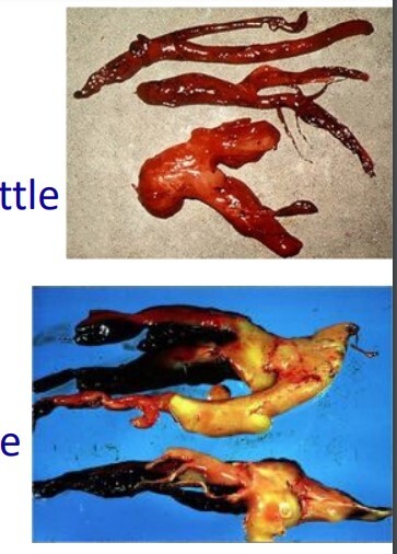 - anti-mortem arterial thrombi are attached, dry and duller + laminated with a tail extending downstream