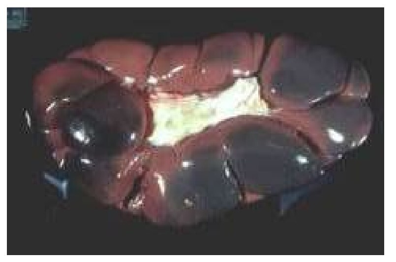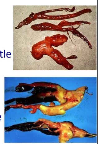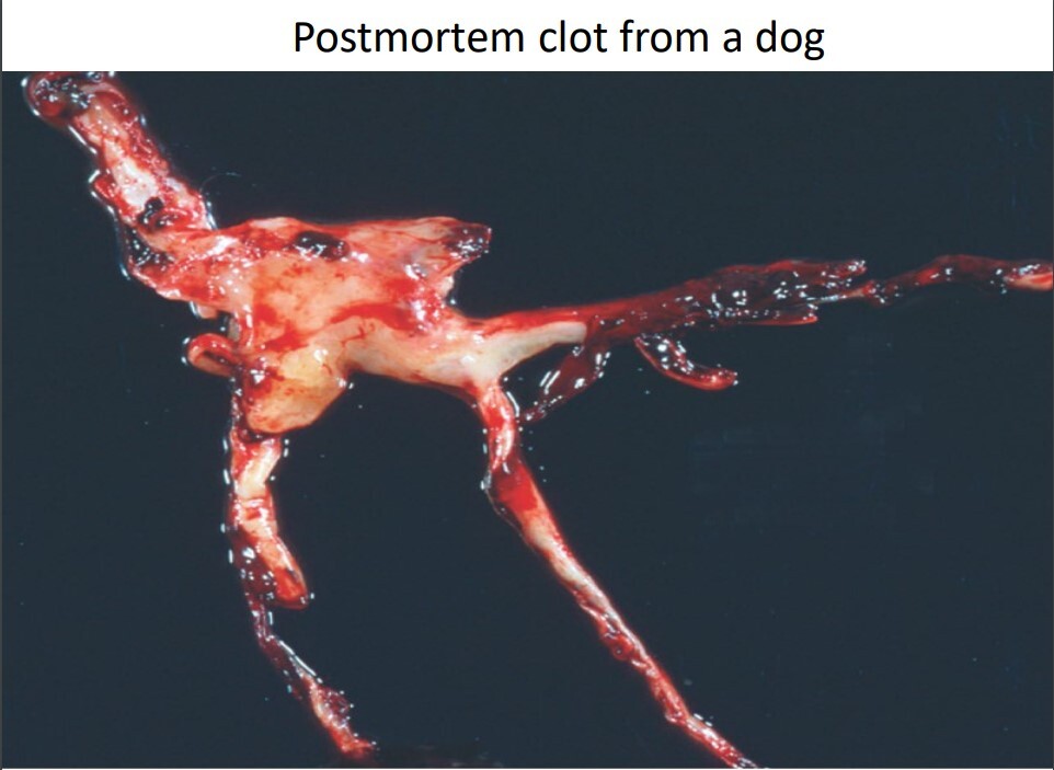 - post-mortem clots are unattached to vessel walls, tend to be shiny, wet and form a perfect cast of the vessel lumen