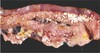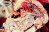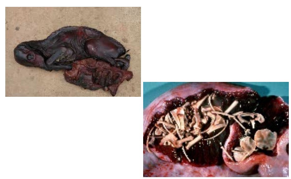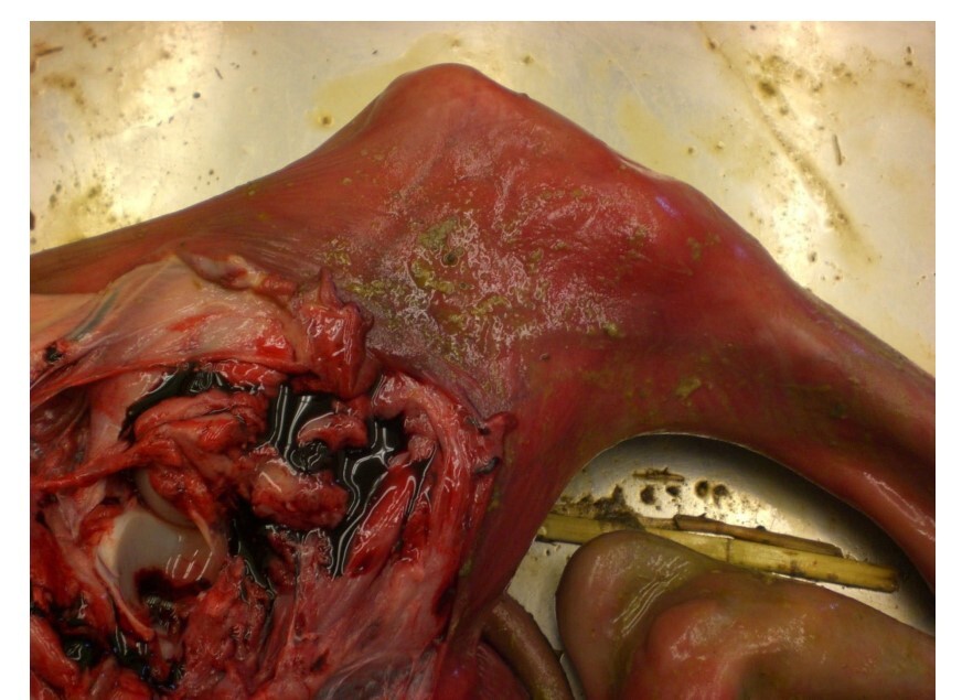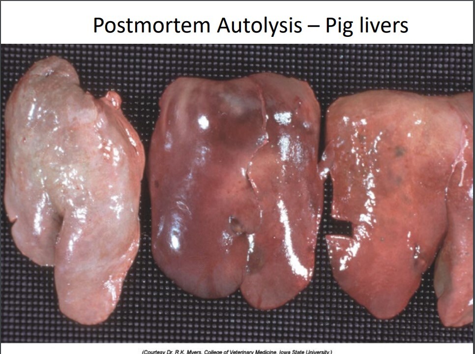 - due to increased abdominal pressure from gas filled intestines or a focal action of post-mortem bacteria