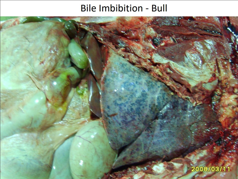 Bile imbibition = Bile from the gallbladder penetrates its wall and stains adjacent tissue yellowish green