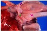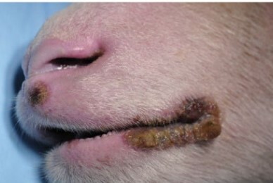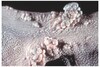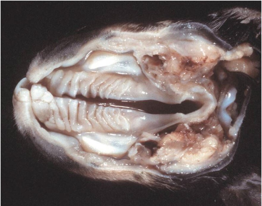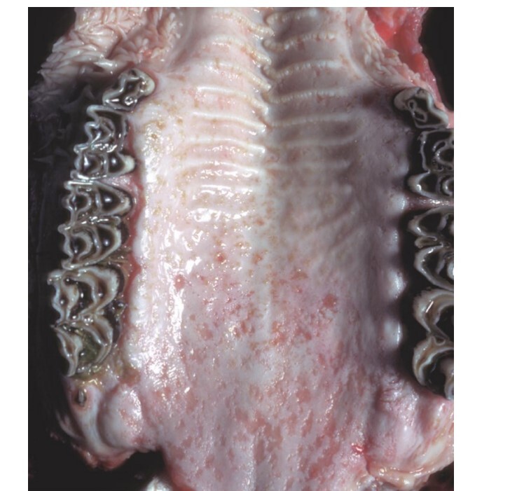 Fluid filled vesicles in the epithelium of the oral cavity, lips, rostral plate and tongue
