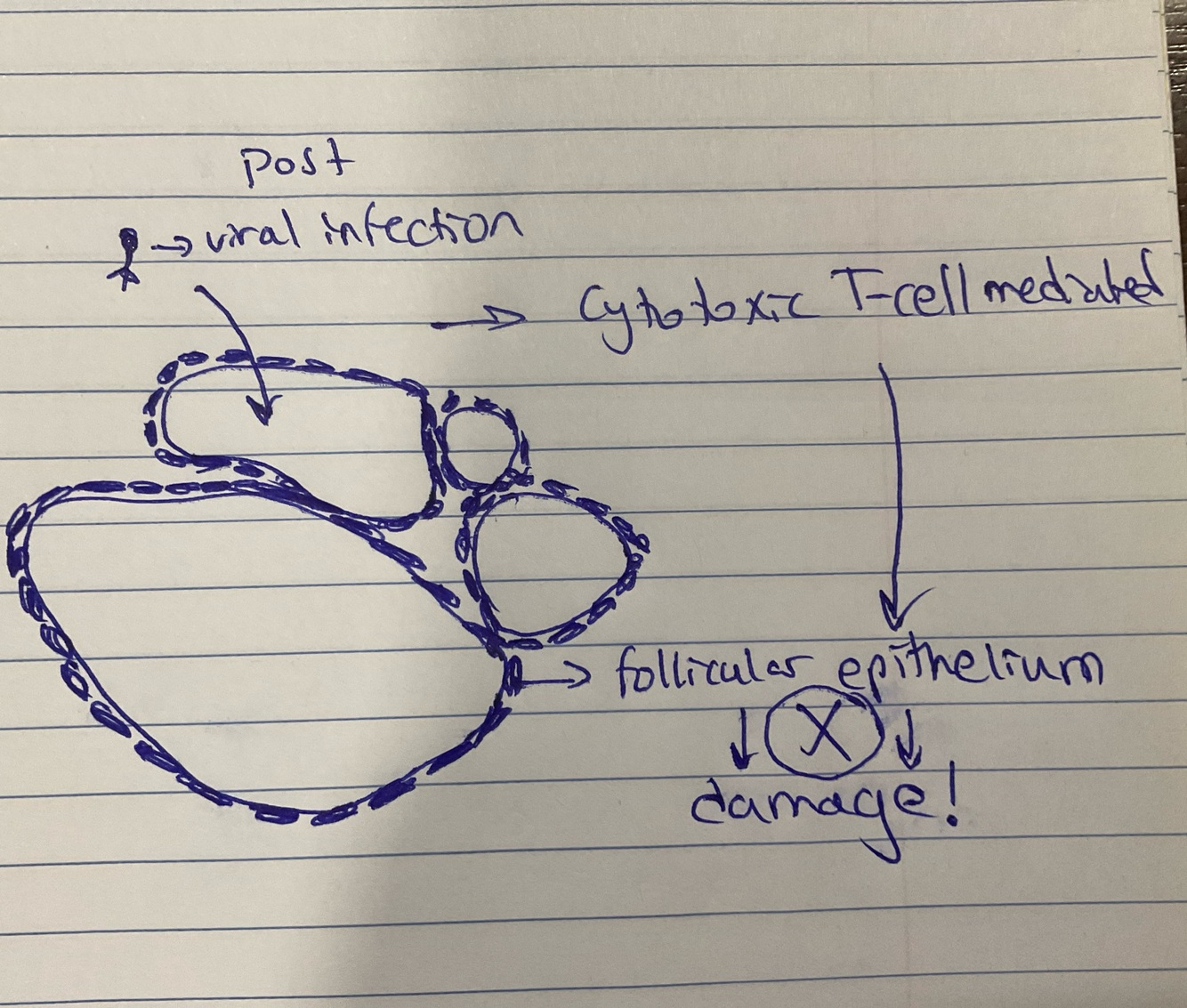 a) It is attributed to a viral infection or post viral inflammatory process, resulting in cytotoxic T-cell-mediated follicular epithelial damage.