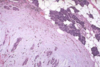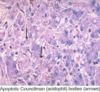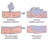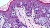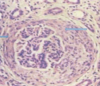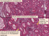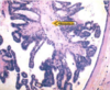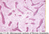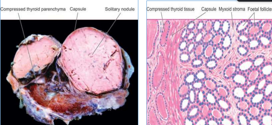 Microscopic : Follicles: Compact, small lined by cubical calls, surrounded by a fibrous capsule .