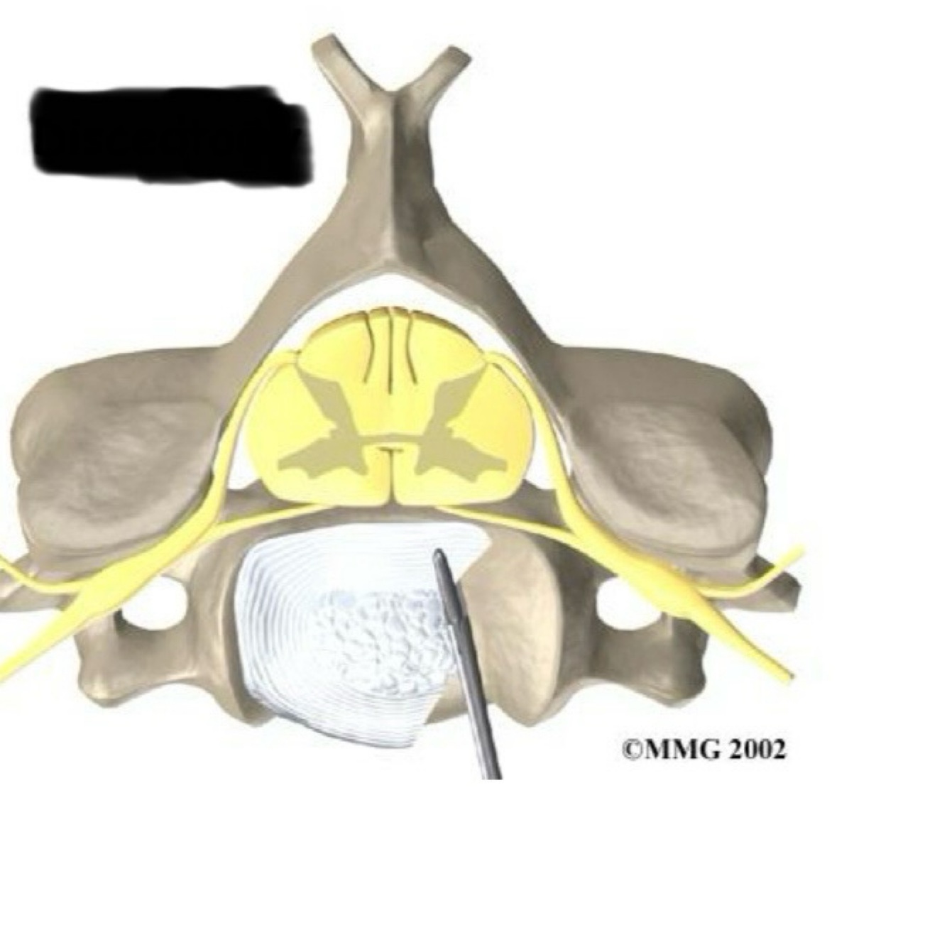 surgical procedure to remove part or all of a damaged intervertebral disc that is pressing on a spinal nerve or the spinal cord.