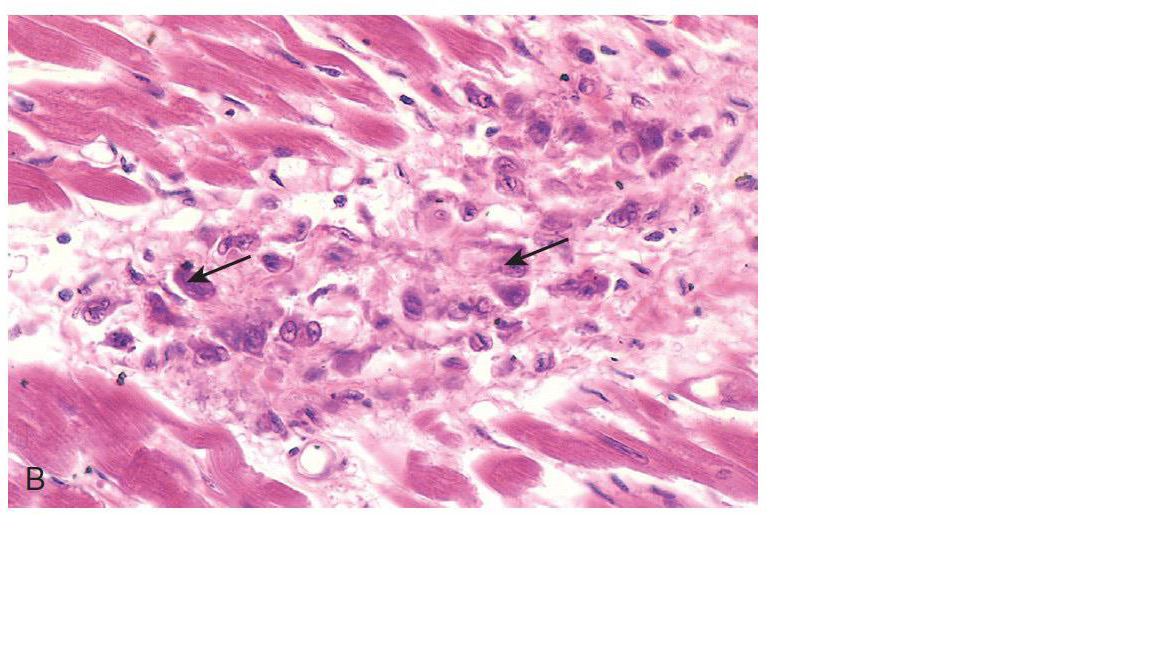 by lymphocytes, plasma cells and Anitschkow cells, found in all 3 layers of the heart – pericardium, myocardium or endocardium