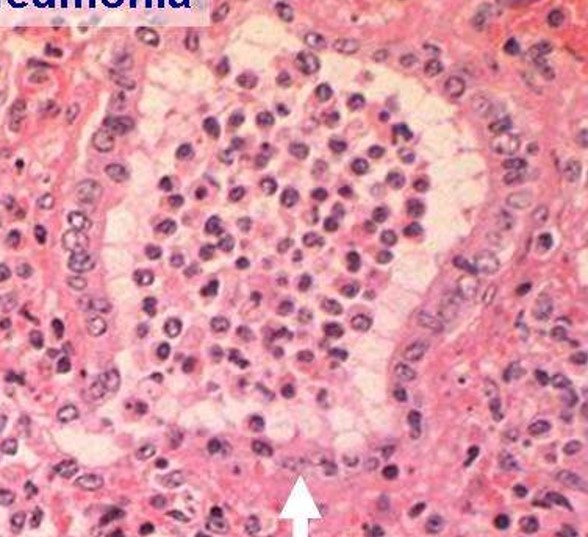 Bronchioles and alveoli with exudation of neutrophils and macrophages. Bright pink = intact septa