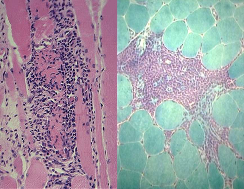 Polymyositis – infiltration inflammation with muscle fiber destruction (left, H&E; right, trichrome). (not rimmed vacuoles like IBM, not perifasicular inflammation like dermatomyositis)
