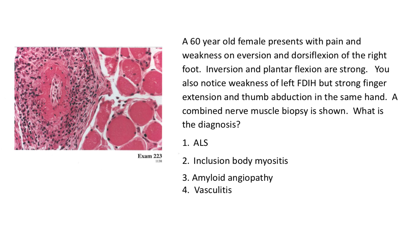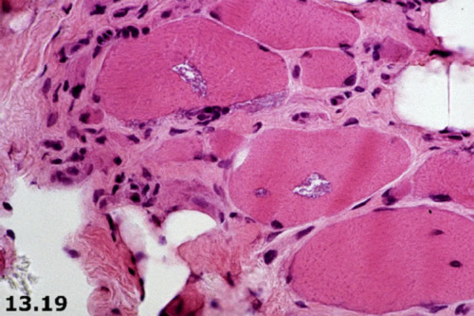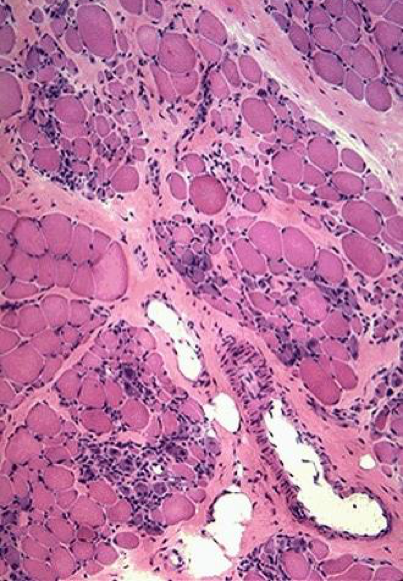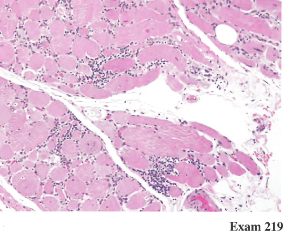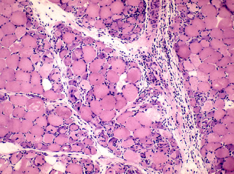 Inclusion Body Myositis – the hallmark of IBM is “rimmed vacuoles”, or vacuolations in the muscle fibers lined with an eosinophilic rim. Less inflammatory infiltrate.