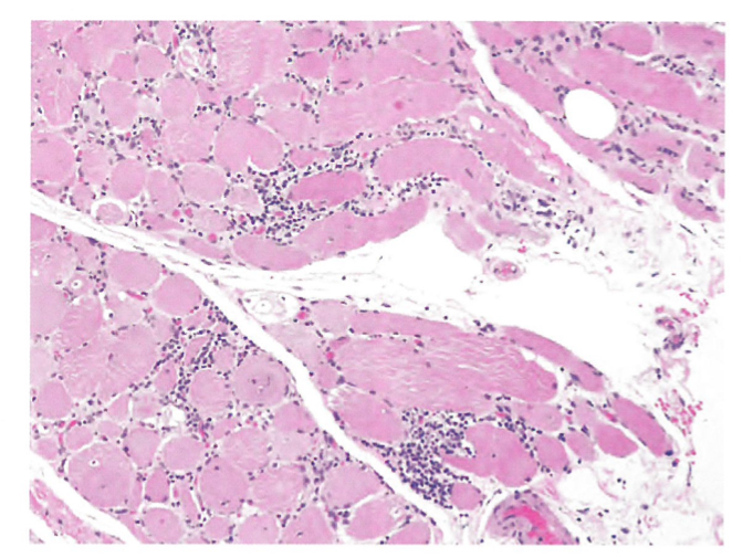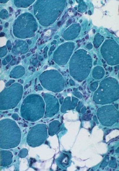 Other histologic features include type II atrophy, fiber type grouping. Usually presents with proximal weakness and pain.