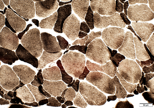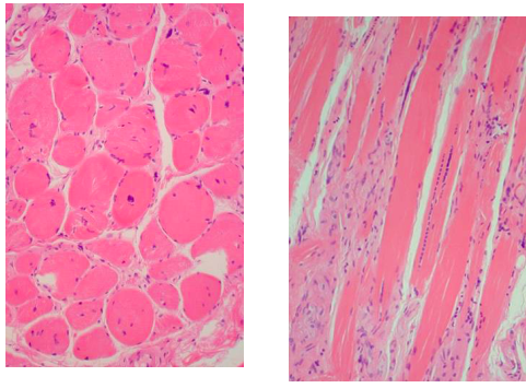 Myotonic Dystrophy – on the left shows multiple internal nuclei characteristic of myotonic dystrophy.