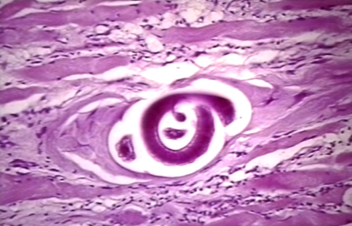 Trichinosis – pictured is a cyst containing the larvae of Trichinella spiralis within muscle. Infection is initiated via ingestion of living larvae in raw or undercooked meat (usually pork) and results in eosinophilc fever and myalgias.