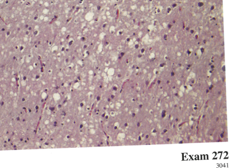 Spongiform degeneration is characteristic of Creutzfeldt-Jacob disease. Most cases are sporadic and occur in patients between 50 and 70 years of age. Iatrogenic transmission can occur but is rare. Startle myoclonus is commonly seen. Although patients may have elevated protein 14-3-3 levels in CSF, this is a non-specific finding which may be seen in other neurologic disorders