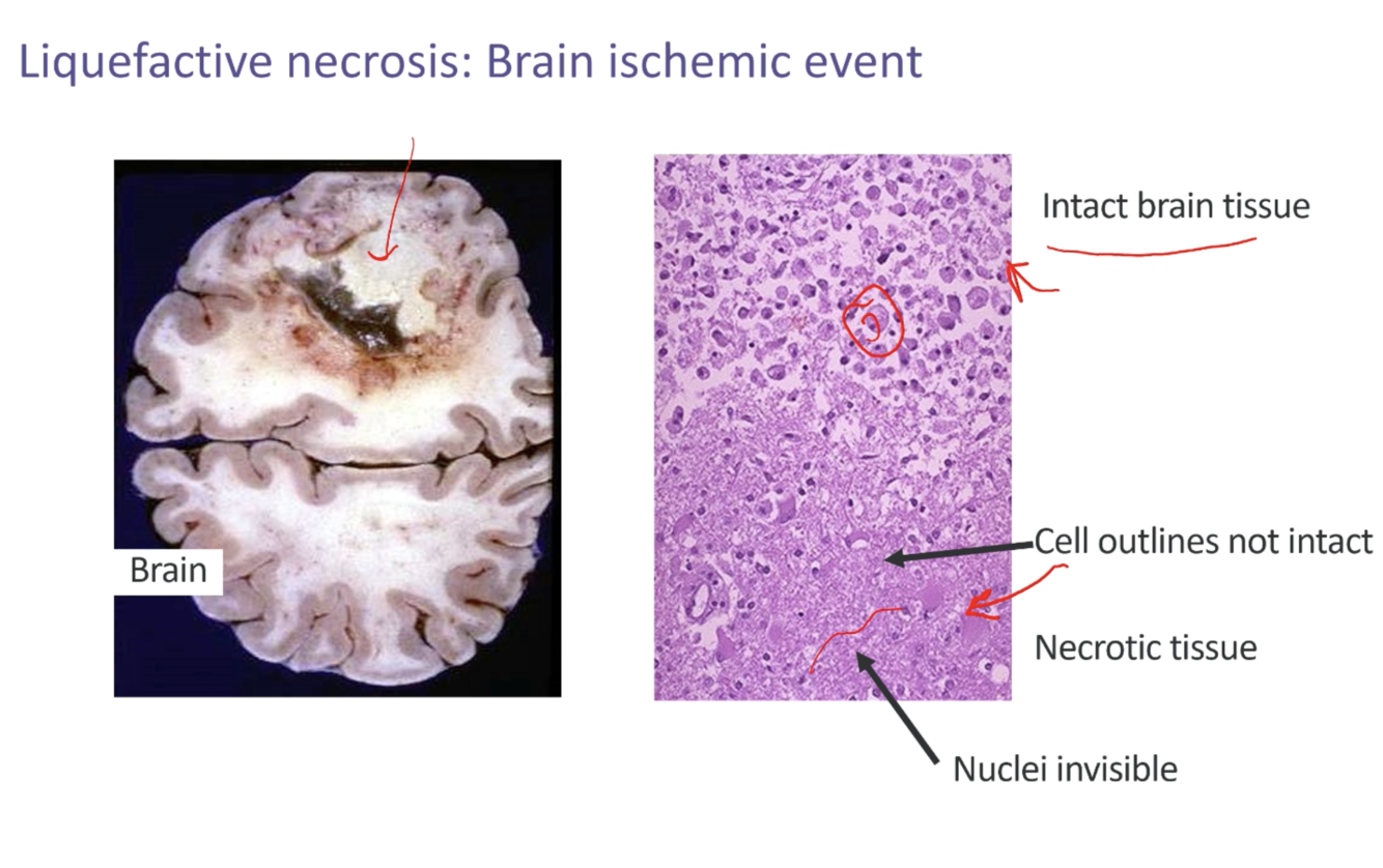 Typically in brain where portion of the brain liquefies in repsonse to an ischemic event