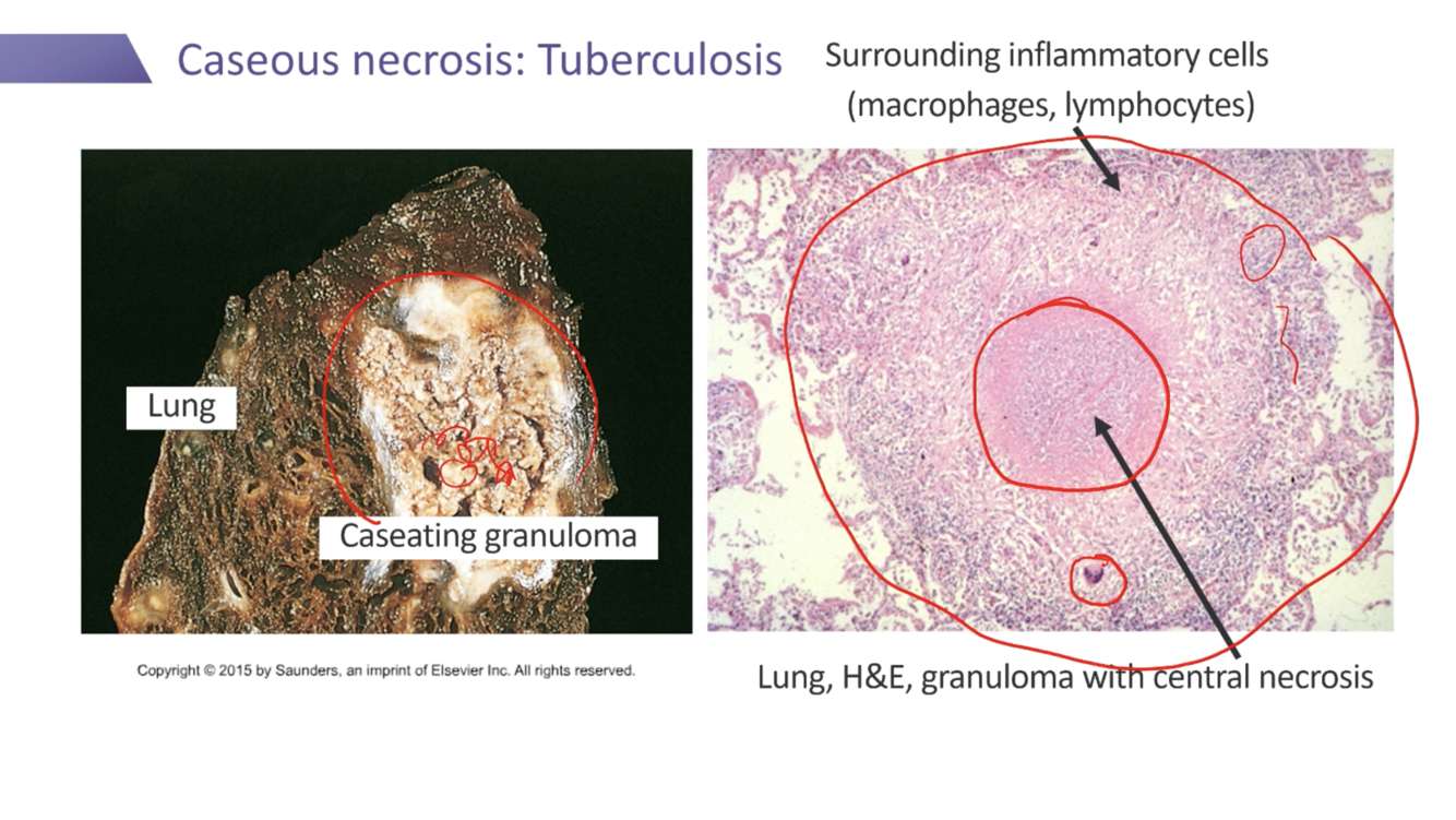 Gross tissue looks like cheese. Microscopically, cells organized in a granuloma with a central portion of necrosis. (nectric donut)