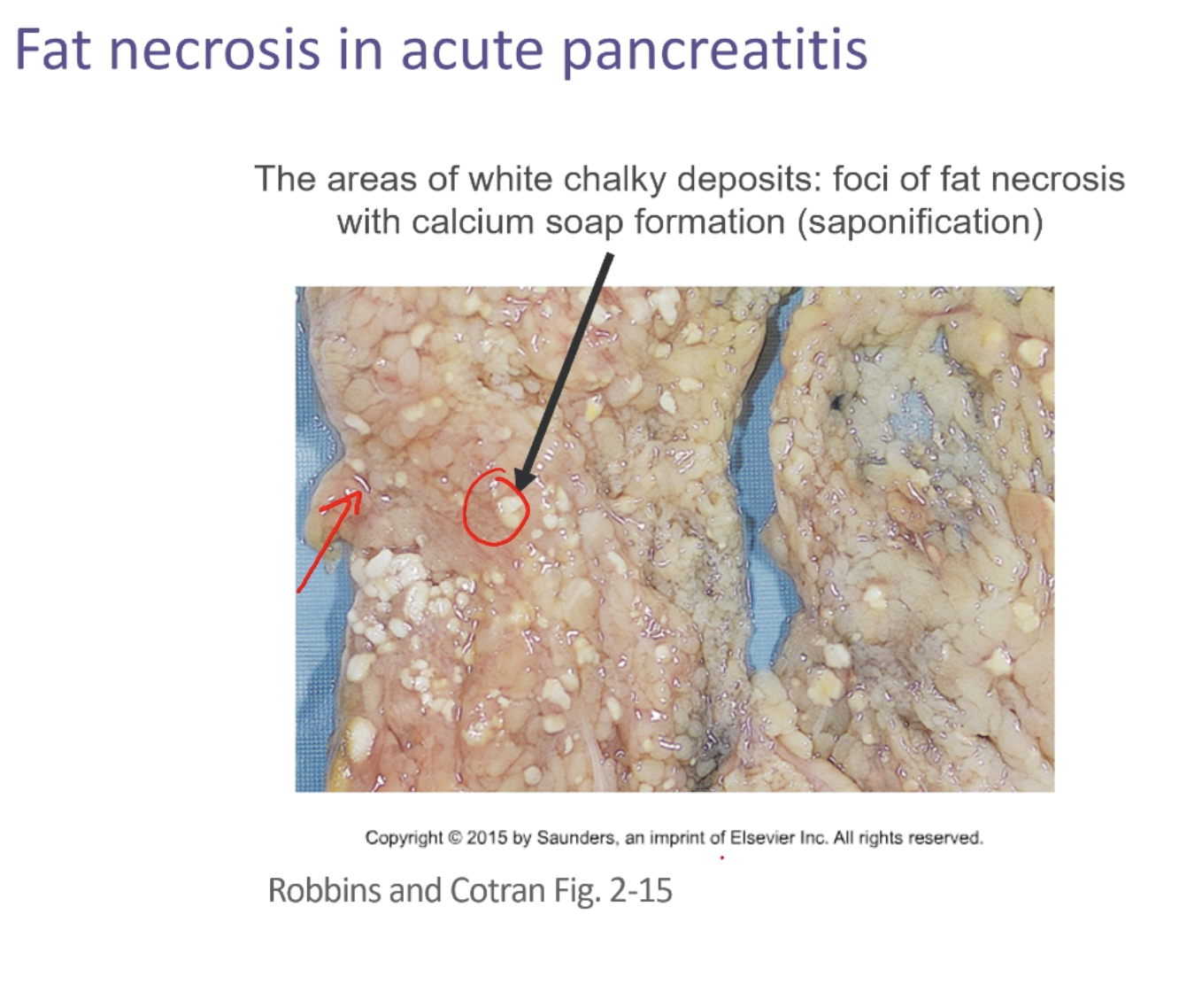 Alcohol / gall stones -> hypersecretion of enzymes which lead to cell damage -> activated lipases -> generation of free fatty acids -> free fatty acids + calcium = soap => saponification
