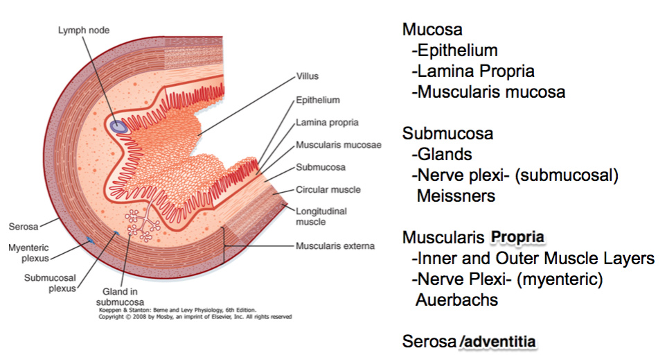 Muscularis externa aka propria (inner circular, outer longitudinal) w/ myenteric (Auerbach’s) plexus