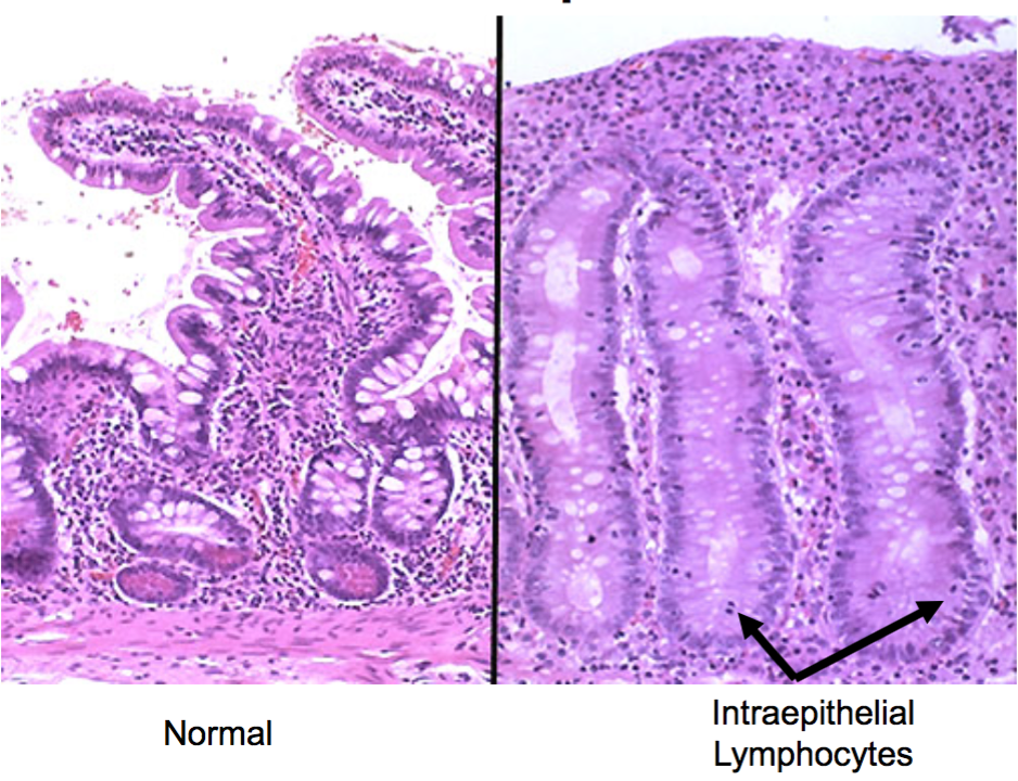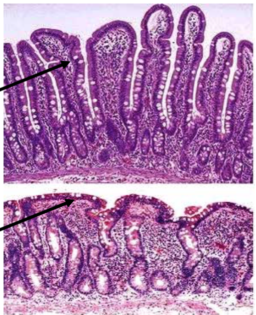 Bottom was from Celiac disease - villi are blunted like a lawnmower came along