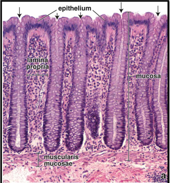 Mucosa includes epithelium, lamina propria, and muscularis mucosa