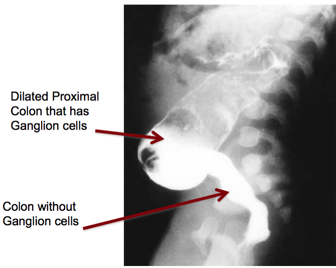 Failure of neural crest migration -> absence of nerve plexi in the distal colon -> poo gets backed up and infants present with megacolon.