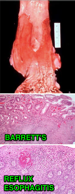 She is presenting with typical symptoms of GERD. Since she has had heartburn for many years, she is at risk for metaplasia to Barrett’s esophagus and possible dysplasia to esophageal adenocarcinoma. Grossly you would see deep pink areas among the normal pale squamous mucosa. Histologically you would see replacement of squamous cells by intestinal type columnar epithelium if she had Barrett’s esophagus. If she did not have Barrett’s you would see squamous hyperplasia and intraepithelial eosinophils.