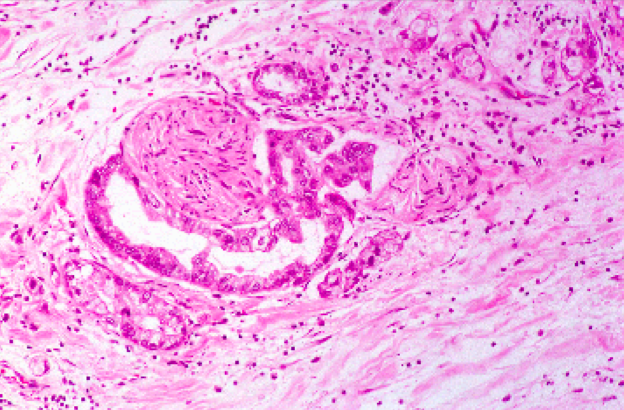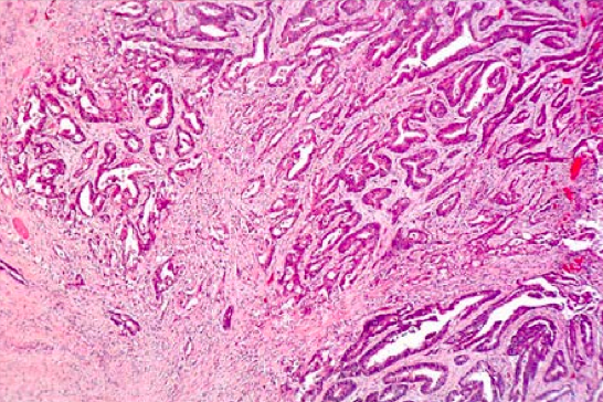 This 49-year-old male, a heavy smoker, presented with a history of recurrent epigastric pain, nausea and vomiting for the past two months. He was found to have scleral icterus. A CT scan of the abdomen revealed a mass within the head of the pancreas. A laparotomy was performed yielding a firm, ill-defined mass within the head of the pancreas and infiltrating surrounding peripancreatic tissue. The patient died soon after surgery. What would you expect to see on histological examination of the tumor?