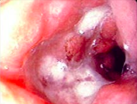 50% of all esophageal carcinomas are adenocarcinomas (shown below). However, they usually present lower in the esophagus. With his lifestyle choices, squamous cell carcinoma is also common. Finally, leiomyomas can also occur in the esophagus.