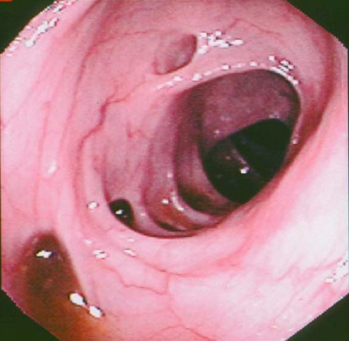 A 56-year-old journalist presented with symptoms of an acute abdomen. There was a long history of vague lower abdominal discomfort and occasional pain. He traveled frequently and often “ate on the run.” A stool sample was positive for occult blood. The WBC was 12,000 with a “shift to the left.” Endoscopy is shown below. What caused him to have this condition?
