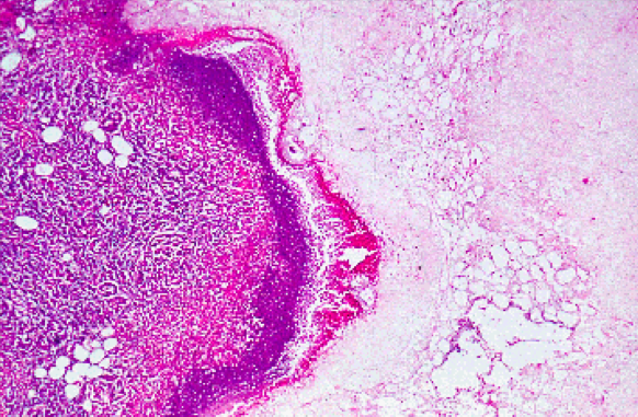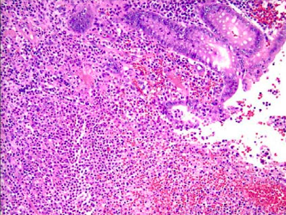 Sloughed mucosa in lumen, PMNs everywhere, interstitial hemorrhage and dirty fat.