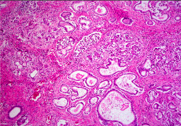 A 50-year-old alcoholic seeks medical attention for recurrent bouts of abdominal pain exacerbated with ethanol ingestion. Physical exam reveals decreased bowel sounds, abdominal tenderness and guarding. Serum amylase and lipase increased. Urine positive for glucose. Imaging studies show a large cystic mass in the pancreas and the presence of diffuse calcification and concretions within the pancreatic duct. What would you expect to see on histological examination of this patient’s pancreas?