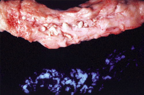 A 62-year-old woman has experienced frequent heartburn for many years. For the last 2 months she has noted difficulty swallowing solid food. She reports that she can’t sleep except when sitting in her recliner chair; takes multiple antacid medications. Moderately obese, WBC 4,300, HCT 37%, MCV 82. What would you expect to see on gross and histological examination of this patient’s esophagus?