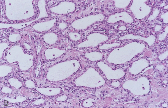 The patient is a 66-year-old woman who presented to the ER with abdominal pain.. Mass palpable in left upper quadrant. Imaging studies revealed cystic mass at the head of the pancreas. What would you expect to see on histologic examination of the mass?