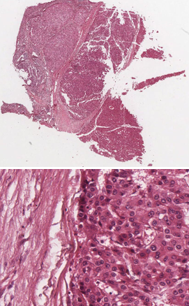 A 55-year-old woman developed ascites and died. There was a history of viral hepatitis associated with a blood transfusion 21 years ago while she worked in Taiwan as a missionary. She is diagnosed with hepatocellular carcinoma. What would you expect biopsy to look like?