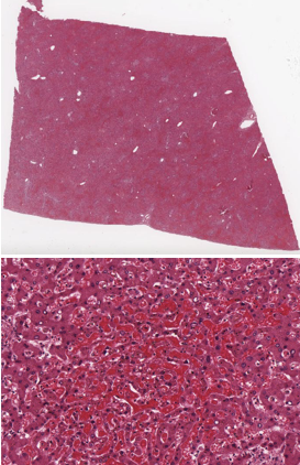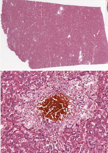 65 yo female with history of heart failure presents to the clinic with increasing swelling of the lower extremities and increasing fatigue. She had a myocardial infarction 2 years ago. Her father died of a MI at the age of 50. She has 2+ pitting edema of the lower extremities. She has had increasing levels of AST and ALT. What would you expect her liver biopsy to look like?