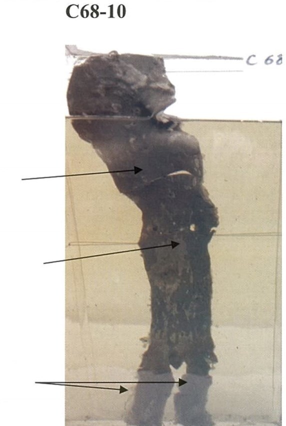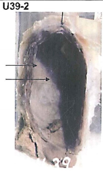 Cut shows many recent infracts which are wedged-shaped