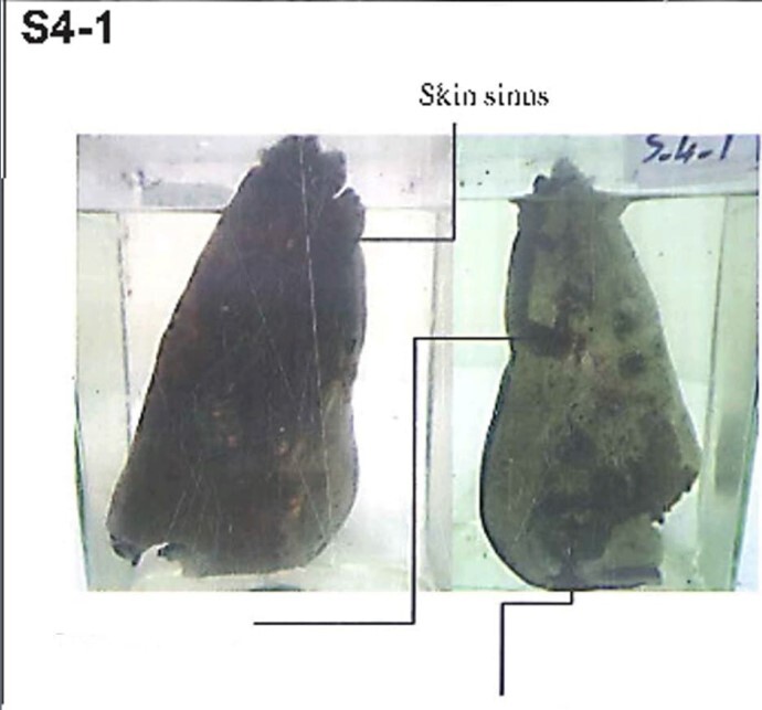 The cut surface shows multiple irregular small abscess cavities