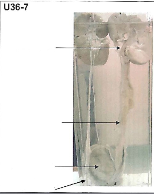 left ureter is thickened, marked dilated and yellow patches.