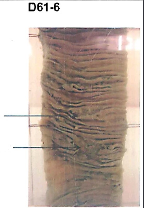Mucosa has many transverse ulcers