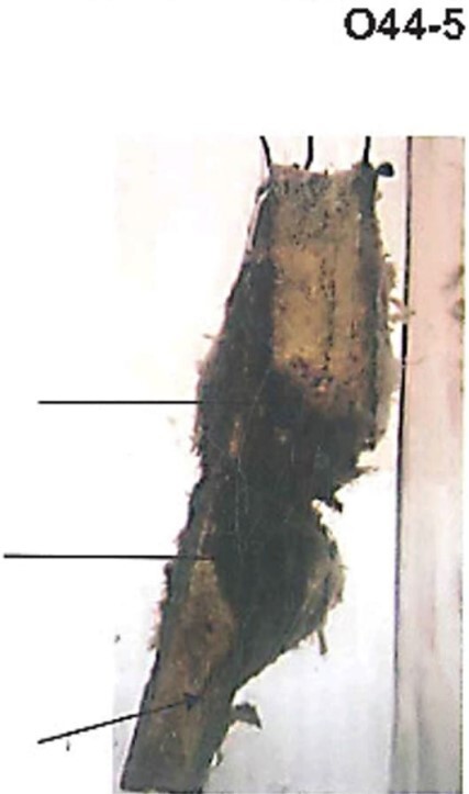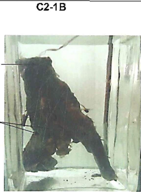 Wall is perforated near the tip with yellowish exudates deposited on the outer surface.