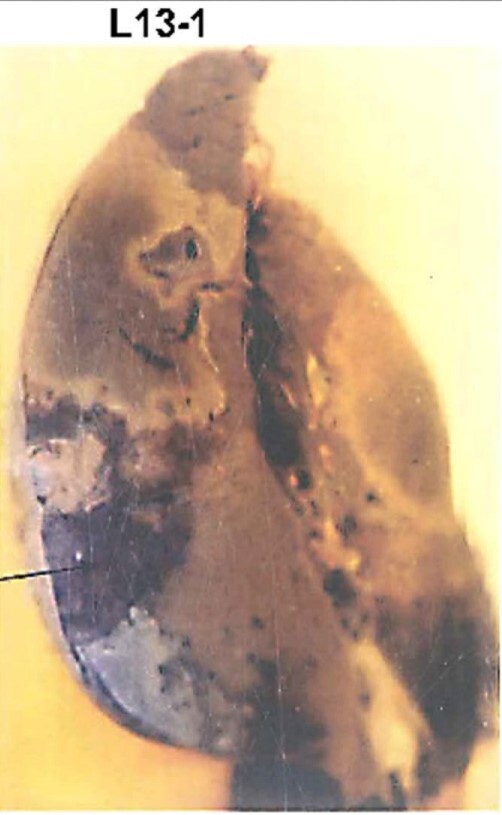 The cut surface of the lung shows numerous scattered small caseous foci