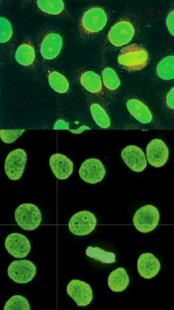 Homogenous pattern = anti-histone (drug-induced lupus) and anti-dsDNA (SLE)